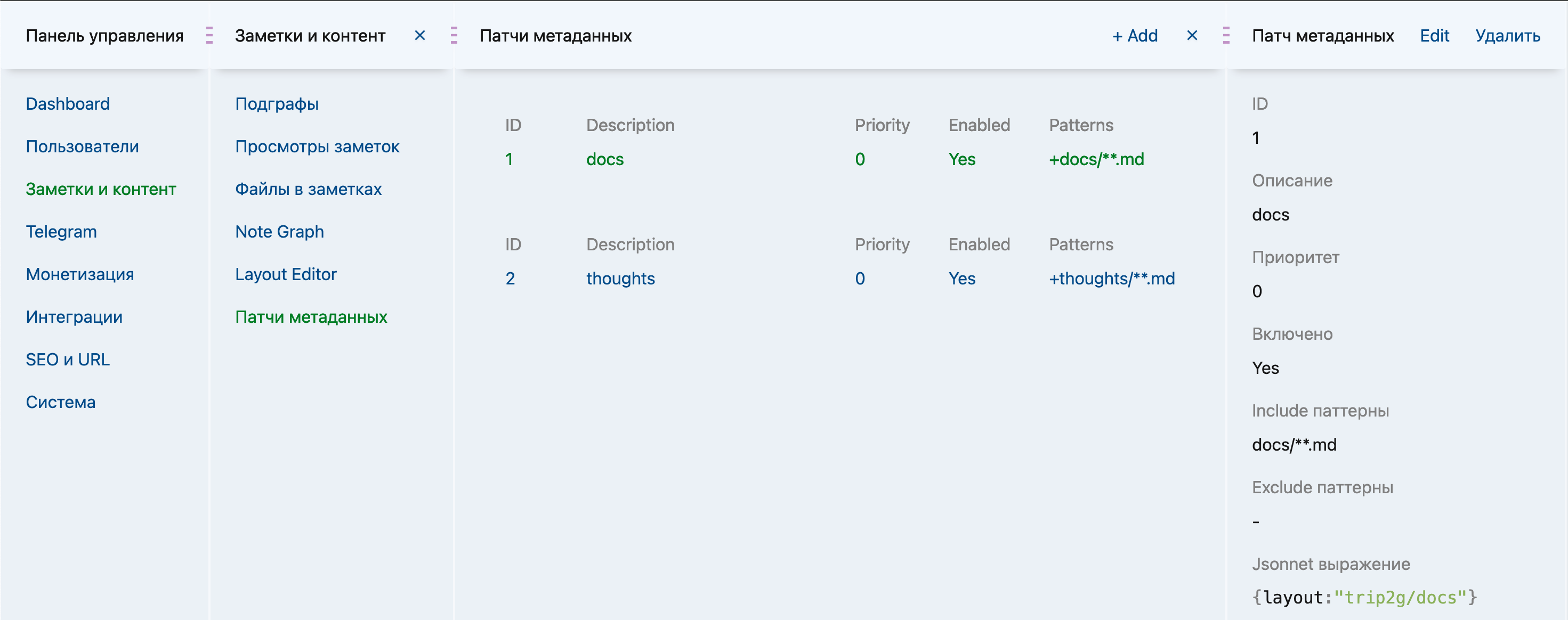 Frontmatter-патч работает так: вы указываете паттерн путей и выражение, которое добавляет или меняет свойства заметок. Система применяет патч при загрузке, до рендеринга страницы. Заметки остаются чистыми, в их frontmatter ничего не меняется.