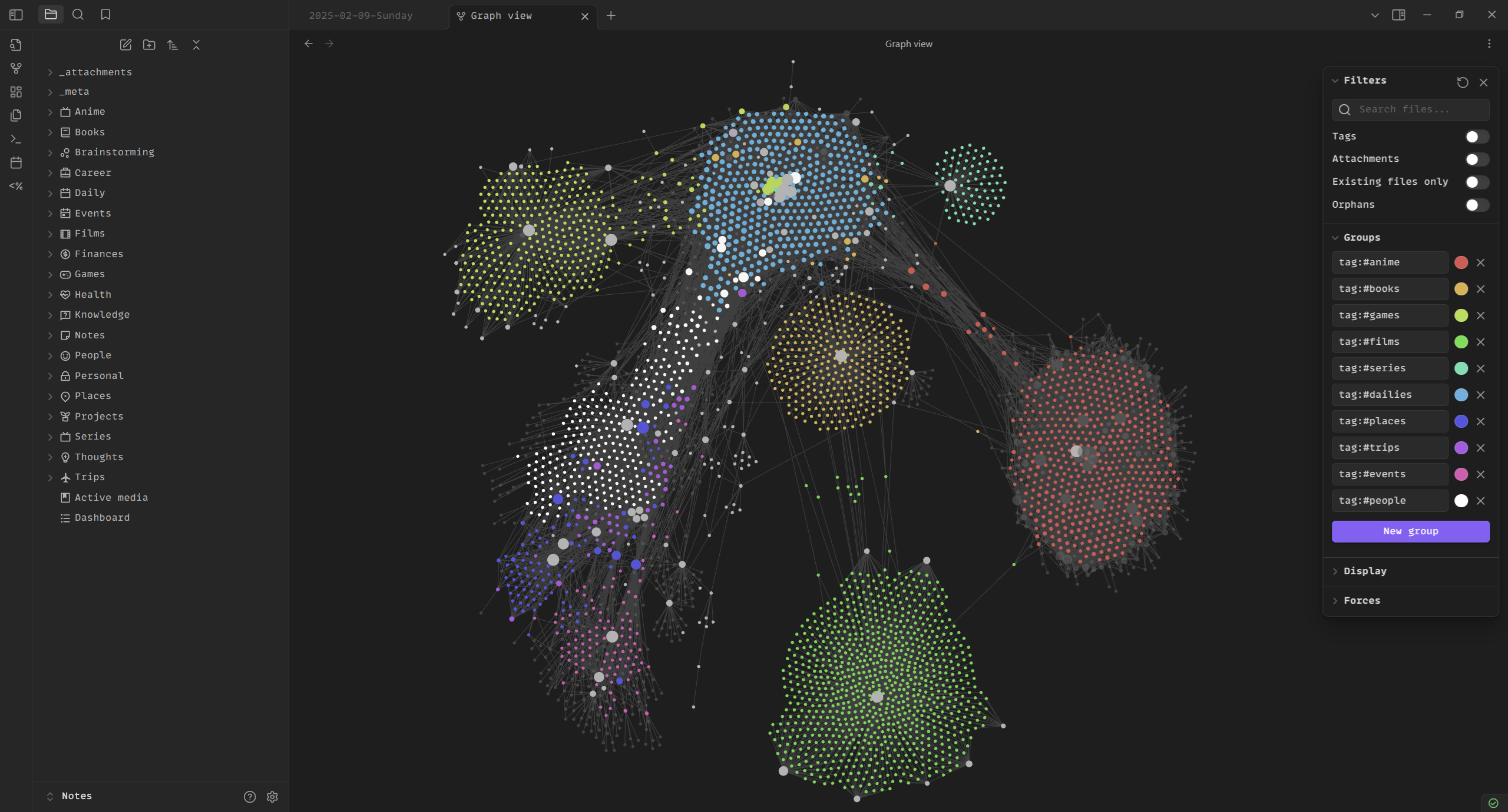 Obsidian can render your entire vault as a graph — nodes and edges showing how notes connect. Use it to find gaps in your knowledge, spot unexpected relationships, and understand the shape of what you've built.